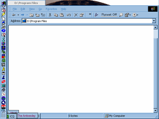 System Tray HellWhen Microsoft designed Windows, who knows what they were thinking when they created the system tray... Maybe they were thinking "Let's make a place where applications can put icons where they'll take up less room and be out of the way." You know, they could have just made the taskbar configuarable enough that you can do something useful like turn off the text. (Actually, you can turn off the text - it's called putting your task bar down one side of the screen and shrinking it so only the icons are visible, but I digress.) Now it seems like every time I install a piece of software, it has a handy little icons that sits in your system tray. Isn't that lovely? However the system tray (for some inaine reason) cannot be detatched from the task bar. So what happens when the system tray grows too big for the Task Bar? Being somewhat bored, I changed my screen resolution to 640 by 480 and started up as many system tray applications as I could. This is the result. Not really very elegant, Microsoft... From the top: McAfee Virus scan, Norton CrashGuard, Task scheduler, Winamp, Intellipoint, Matrox Quickdesk, HP Precisionscan, Real Player, McAfee Scheduler, MSN Instant Messanger, Getright, Flyswat, Dial Up Networking, mIRC, Resource Meter, ICQ, Pegasus, AIM, Napster, Miva Mia, Shockwave, ThingTray, eBot, RamBooster, Comet Cursor, Windowblinds, something I don't remember, Agent(Merlin), and two Traymenu icons. (And I still had 5% resources left!) Addendum: Looks like they've changed the way the system tray works in XP - you can let it hide icons you haven't clicked on in a while. hmm... | |